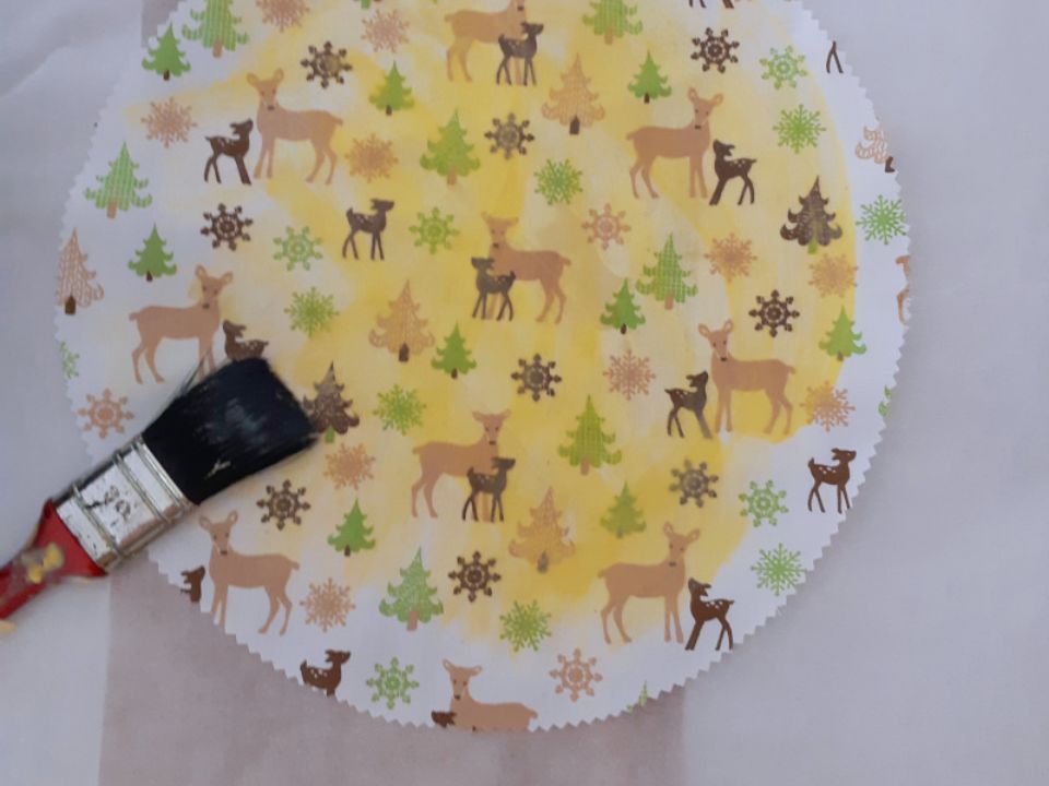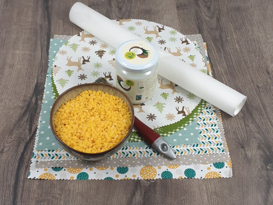 Den vorbereiteten Baumwollstoff auf das Backpapier legen und das Bienenwachs schnell von der Mitte aus mit dem Pinsel aufstreichen. Nicht zu viel Wachs nehmen. Ein zweites Stück Backpapier auf den Stoff mit dem Wachs legen.