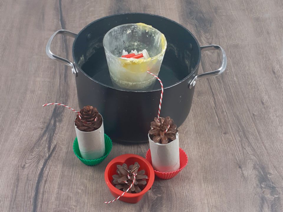 Silikon-Muffinformen vorbereiten. Holzspäne und Tannenzapfen in die Muffinformen füllen. Flüssiges Wachs in die Muffinformen giessen.