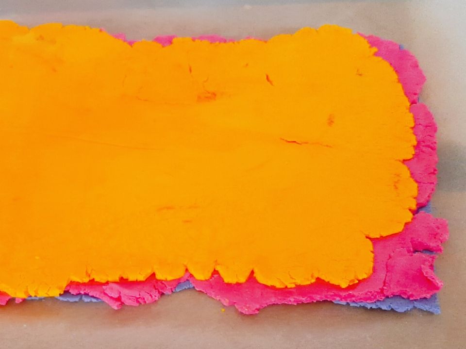 - Teig in Schüsseln aufteilen und nach Wunsch Lebensmittelfarben einkneten.