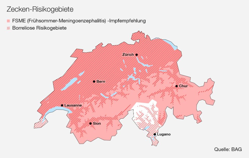 Laut Angaben des Bundesamtes für Gesundheit (BAG) erkranken pro Jahr in der Schweiz 6000 bis 12000 Personen an Borreliose. Die Krankheit erfordert eine Behandlung mit Antibiotika und kann bei rechtzeitiger Diagnose vollständig geheilt werden. Seltener ist die Erkrankung mit dem FSME-Virus. Seit einigen Jahren nehmen die Fälle von Frühsommer-Meningoenzephalitis (FSME) aber stark zu. Zwar ist nur ein kleiner Prozentteil der Zecken mit dem Virus infiziert, doch gibt es gegen die Hirnhautentzündung mit teilweise schwerem Krankheitsverlauf keine Therapie, lediglich die Symptome kann man lindern. Deshalb empfiehlt das BAG die Impfung gegen Frühsommer-Meningoenzephalitis allen Menschen in der Schweiz, die bei Aktivitäten im Freien und insbesondere im Wald, Zecken ausgesetzt sind. Ausgenommen sind die Kantone Tessin und Genf. Die Impf-Kosten werden von der Grundversicherung übernommen sofern Sie in einem Risikogebiet wohnen.