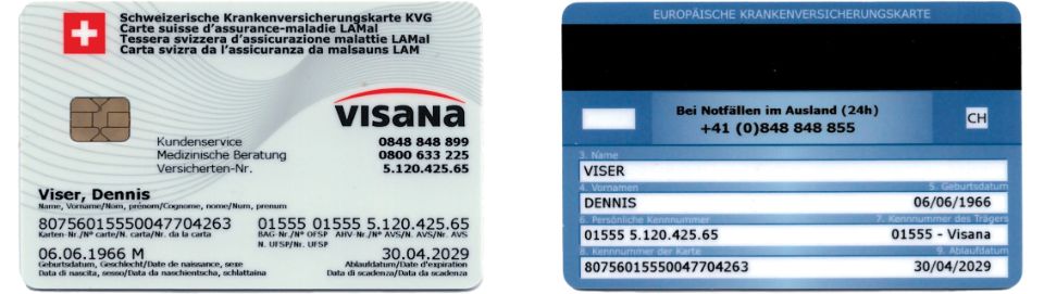Ihre wichtigsten Versicherungsdaten sind auf der Krankenversicherungskarte angezeigt. Zudem sind persönliche Daten auf dem Chip gespeichert. Für Abrechnungen können Leistungserbringer (Ärzte, Apotheken, Spitäler) die notwendigen Informationen einfach übernehmen.