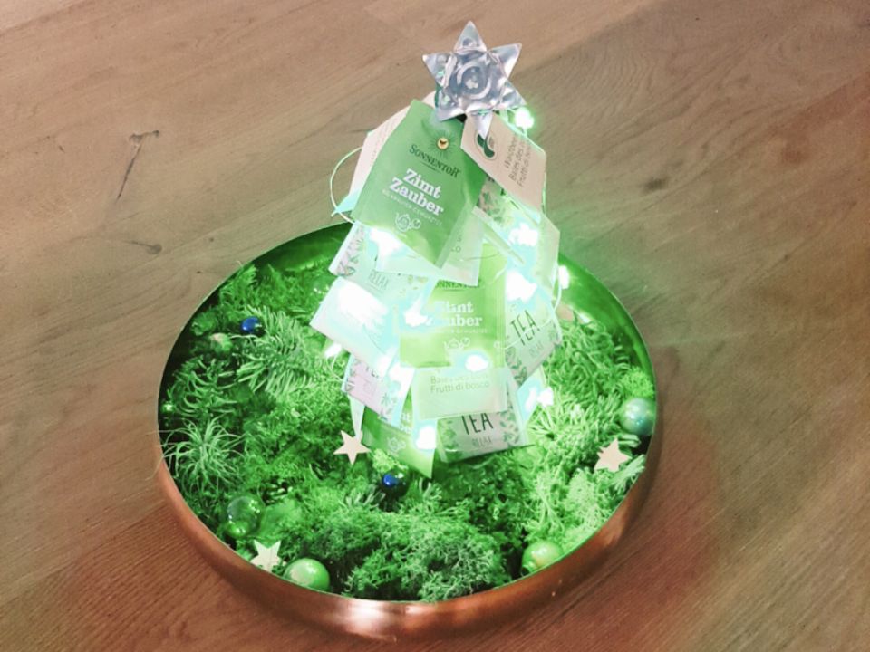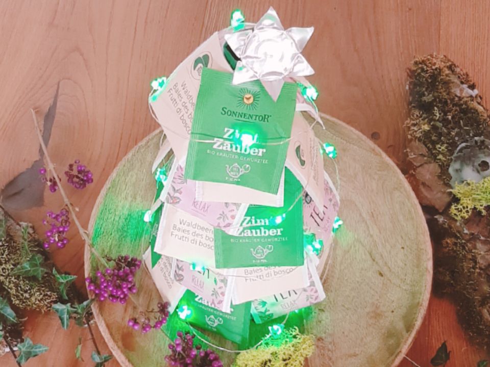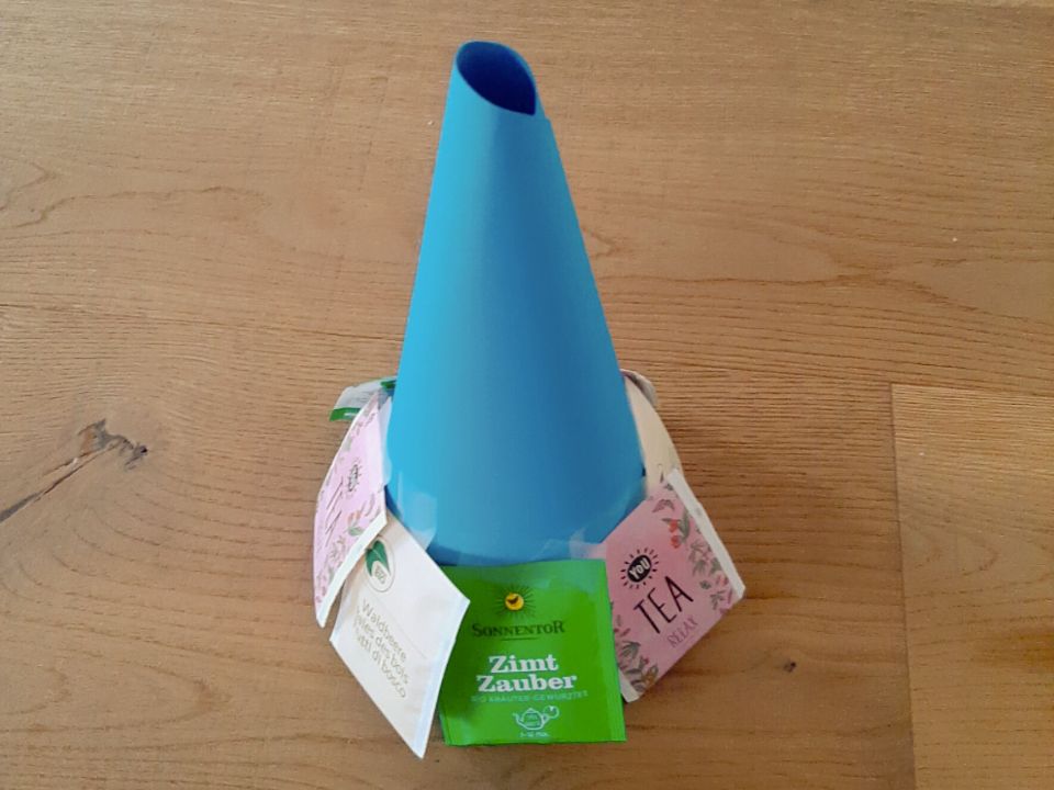 - Fixer ensuite les sachets de thés sur le cône avec du ruban adhésif, couche par couche, en les superposant.