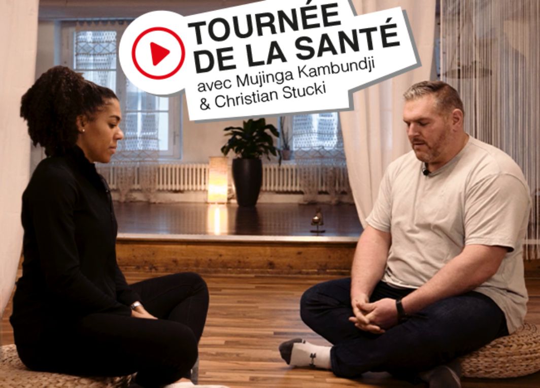Dans la nouvelle vidéo de notre série de vlogs «Tournée de la santé», les deux sportifs de haut niveau, Mujinga Kambundji et Christian Stucki, vous montrent ce qu’ils pensent du concept de la pleine conscience et de la méditation et quels mini-rituels ils pratiquent avant une compétition importante. Sandra Bittel, collaboratrice de Visana, leur apporte son soutien sur cette thématique. La responsable de la Gestion de la santé en entreprise travaille également comme coach mentale dans le cadre de son activité.