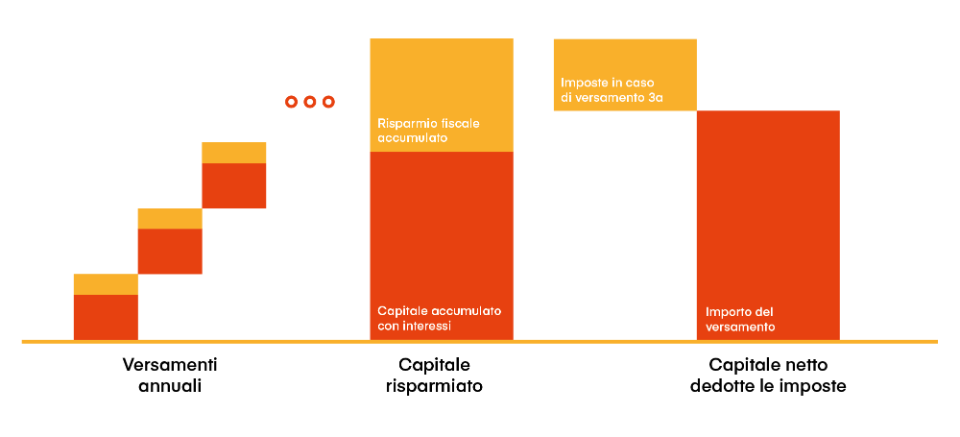 Ma c’è di più: con i versamenti nel pilastro 3a risparmiate sulle imposte, sia quando effettuate i versamenti, sia, di nuovo, quando ritirate i vostri risparmi.