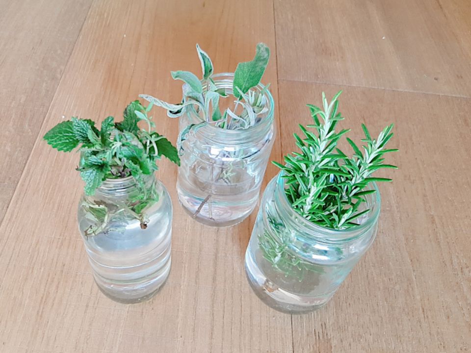 Materiali: stelo di erba aromatica, vasetto di vetro (ad es. quelli per la marmellata), acqua.