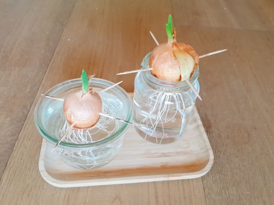 - Tagliate una cipolla intera (oppure tagliate la punta con le radici lasciandovi circa 1 cm di polpa di cipolla) e mettetela in un bicchiere pieno d’acqua.