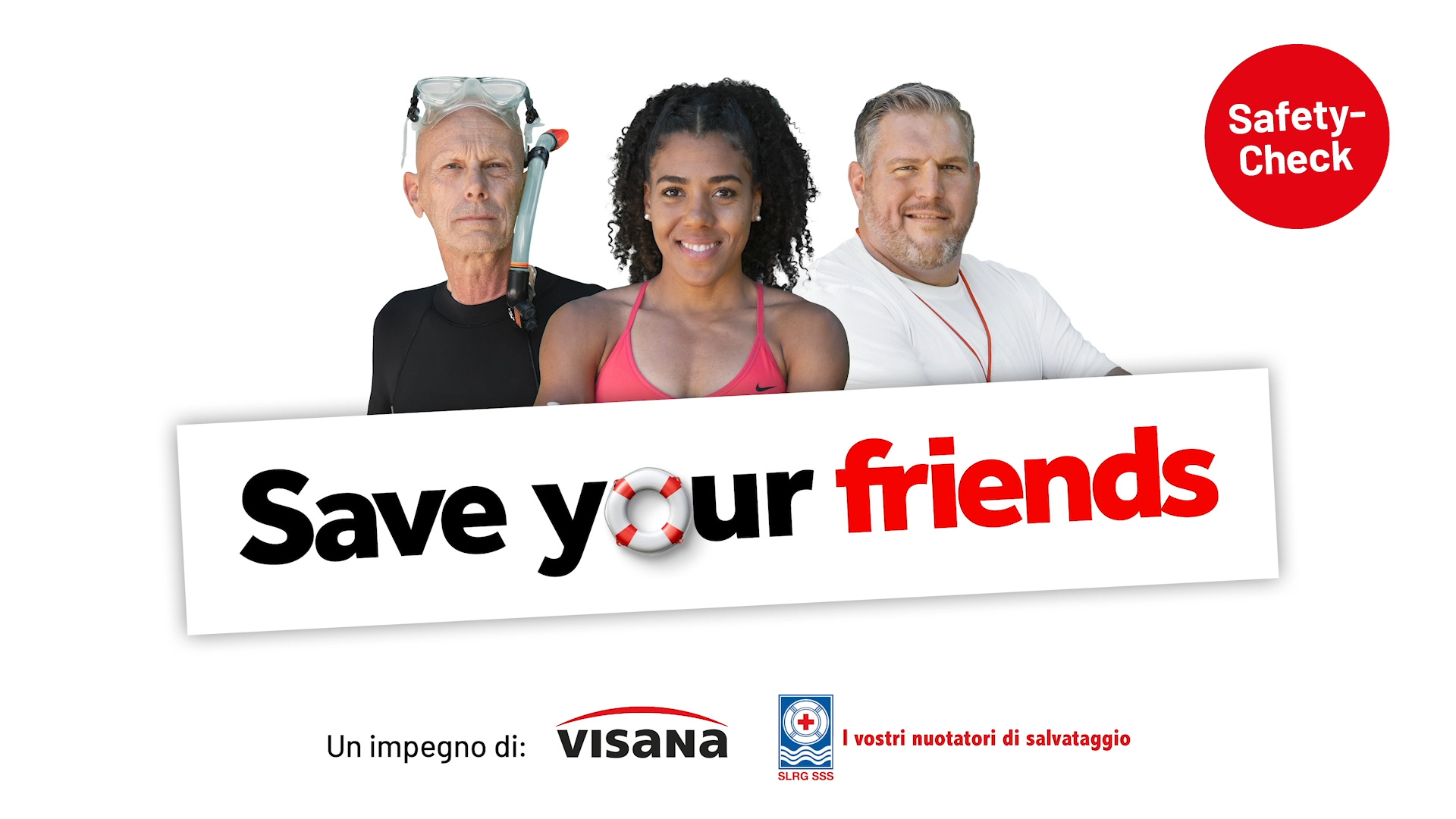 La campagna «Save your friends» della SSS e di Visana dura da fine giugno a metà settembre. La campagna ha come elementi centrali tutta una serie di brevi filmati con messaggi a effetto e le testimonianze sui pericoli letali in e sull’acqua. Inoltre, sul sito web www.saveyourfriends.ch/it sono reperibili in modo completo e comprensibile tutte le informazioni, i messaggi, i consigli e i suggerimenti per divertirsi in acqua in sicurezza, oltre, ovviamente, al nuovo «safety check» (www.saveyourfriends.ch/it/safety-check) e alle regole salvavita per il bagnante della SSS.